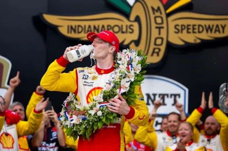 En la imagen fotográfica se observa a Josef Newgarden, piloto de la Indycar Series, celebrando tras ganar la 108ª carrera de las 500 Millas de Indianápolis. Foto NA: Mark J. Rebilas-USA TODAY