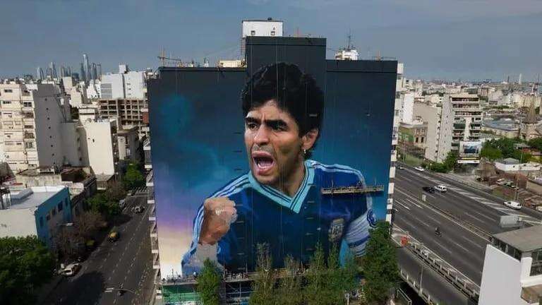 El mural, realizado por el artista Martín Ron y la empresa YPF, tiene 45 metros de altura por 40 de ancho y muestra una imagen de Maradona en el inicio de la final del Mundial de Italia 1990, en la que Argentina cayó con Alemania por 1 a 0, enojado con los aficionados locales que silbaban el Himno argentino.