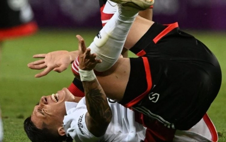 A los 8 minutos, el volante central fue víctima de una patada del futbolista del conjunto chileno César López y quedó notablemente afectado, por lo que segundos después tuvo que dejar el campo de juego.