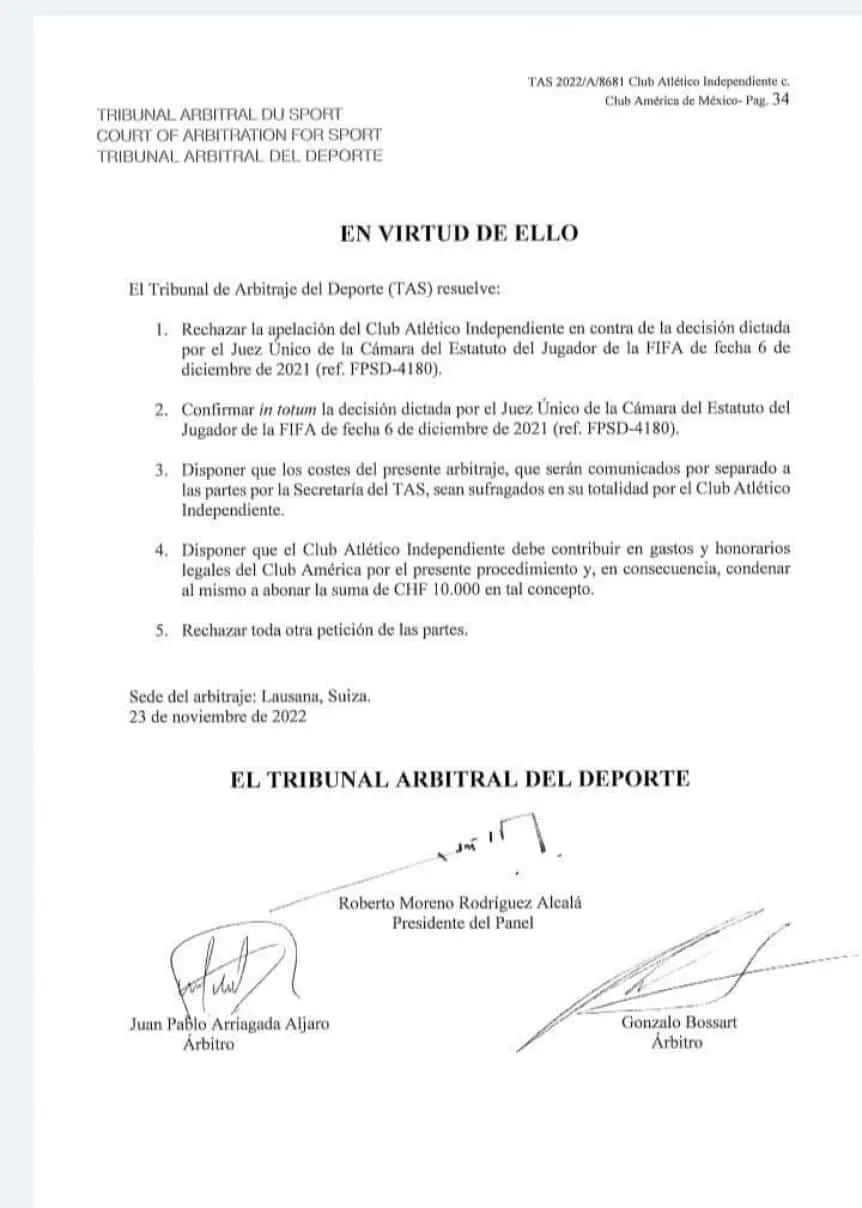 En noviembre de 2022 el organismo realizó un fallo, donde rechazó también recibir otra apelación por parte de Independiente y, además, le exigió pagar los gastos y honorarios legales de este juicio, unos 10.500 dólares, que se suman a los 5.700.000 dólares en concepto de la ficha del atacante paraguayo, incluyendo multas e intereses moratorios.