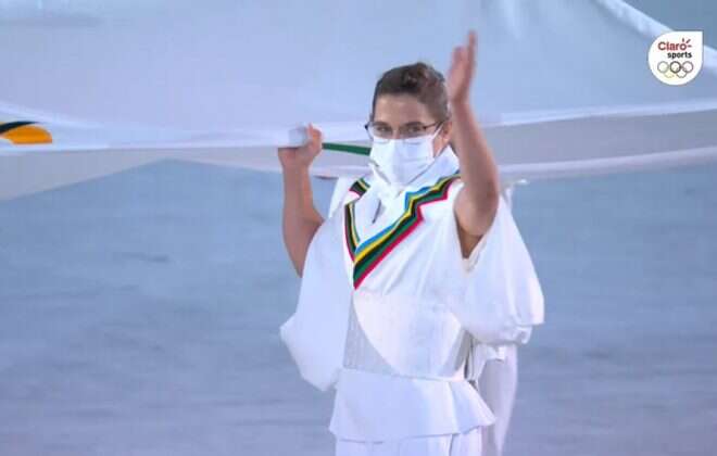 Pareto, de 35 años y médica traumatóloga, ingresó al recinto con la bandera blanca que tiene estampados los cinco anillos olímpicos acompañada por cinco atletas con historia en la competencia, entregando en el centro de escenario la enseña a un grupo de seis trabajadores de la salud.