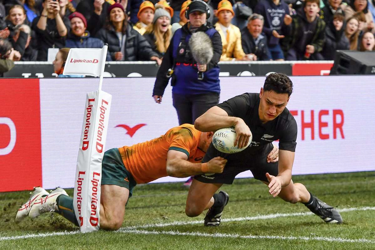 El partido comenzó con acción desde el vestuario, con un try tempranero de Marika Koroibete, convertido por Carter Gordon. Menos de cinco minutos después, los Wallabies volvieron a apoyar en el ingoal local, de la mano de Tom Hooper. Pasado el sacudón inicial de Australia, los All Blacks hicieron pie y comenzaron a ajustar su juego. Damian McKenzie abrió el marcador para los hombres de negro con un penal, pero Gordon hizo lo propio y mantuvo la ventaja a favor de los visitantes.