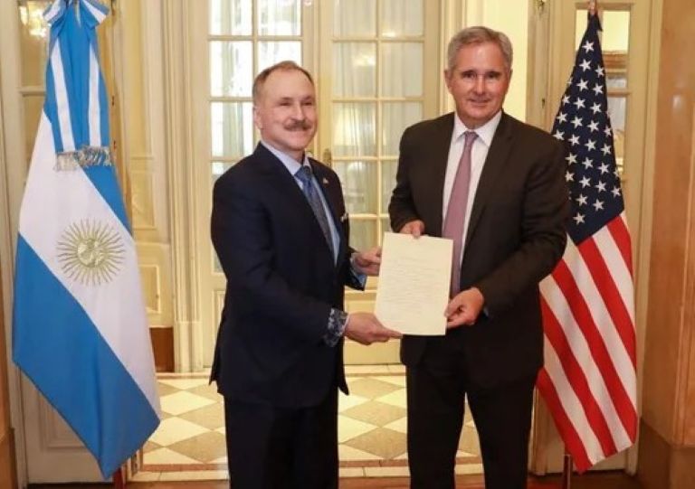 El embajador de los Estados Unidos en la Argentina, Peter Lamelas, entregó hoy copia de cartas credenciales al canciller Pablo Quirno y así completó el trámite que lo formalizó en el cargo.