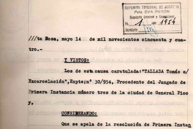 La causa se caratuló “Tallada, Tomás s/excarcelación”, con el número de expediente 30/954, y procedía del Juzgado de Primera Instancia N° 3 de General Pico, que estaba a cargo del juez Carlos Osvaldo Vélez. En ese momento solamente había tres juzgados multifueros en la provincia, dos en Santa Rosa y uno en General Pico.