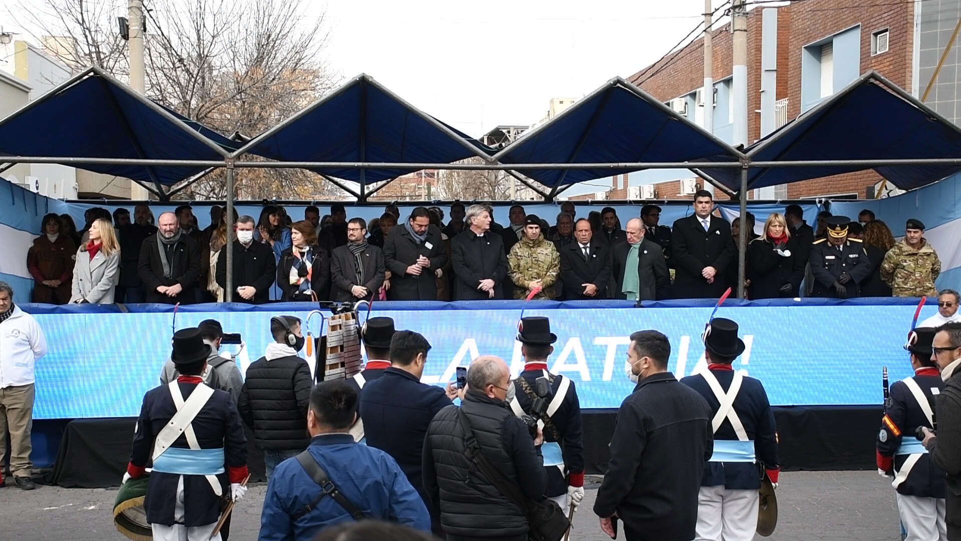 La ceremonia estuvo encabezada por el gobernador de la Provincia, Sergio Ziliotto, acompañado por el intendente municipal de la capital pampeana, Luciano di Nápoli, el comandante de la décima brigada mecanizada, Coronel Roberto Horacio Etchebest, la ministra a cargo de la presidencia del Superior Tribunal de Justicia, Elena Victoria Fresco, ministros del Poder Ejecutivo Provincial (Pablo Maccione de Educación, Horacio di Nápoli de Seguridad, Diego Ãlvarez de Desarrollo Social y Mario Kohan de Salud), los senadores nacionales Daniel Pablo Bensusán y Daniel Kroneberger, la diputada nacional Varinia Marín, autoridades provinciales, legislativas, municipales, militares, policiales, de la Universidad Nacional de La Pampa, veteranos de Guerra, docentes, estudiantes, familias y comunidad en general.