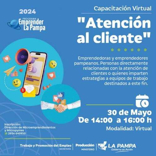 A través del Programa Emprender La Pampa 2024, que lleva adelante la Dirección de Microemprendimientos y Micropymes del Ministerio de la Producción y en un trabajo conjunto con la Secretaría de Trabajo y Promoción del Empleo, se realizará una Capacitación sobre Atención al cliente.