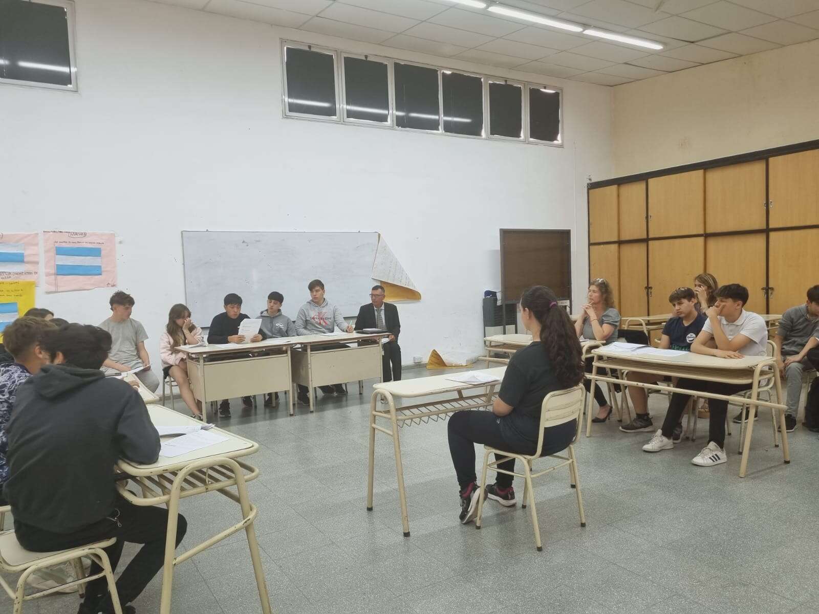 El simulacro se realizó en el Sum de la escuela Leuvuco, cuya directora es Alfonsina Pescara, donde se dispuso una “sala de debate” en la que los/las alumnos/as desplegaron los roles que habían estado preparando previamente- con una causa con dos imputados por un caso de robo agravado por el uso de arma de fuego, aportadas por el programa Educación + Justicia-; junto a las docentes de cada curso, en el aula.