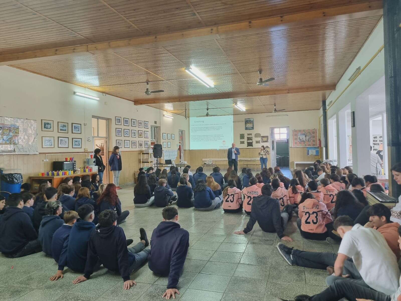 En primer lugar se emitió un video referente a un caso de grooming. Luego el juez de audiencia, Federico Pellegrino, conversó con los/las alumnos/as sobre especificaciones del tipo de delito aludido que “se origina cuando un adulto acosa sexualmente a un niño o niña mediante el uso de tecnologías”. Agregó consideraciones sobre los peligros que implica compartir datos privados en las redes sociales ya que “una vez que lo compartimos, ya deja de ser privado”. Explicó que en Argentina, el grooming es un delito penado por la ley N° 26.904 e incluido en el Código Penal desde el año 2013. Detalló la diferencia entre grooming y ciberbullying, y entre otras consideraciones, destacó también la necesidad de cuidar los contenidos que se suben a las redes y/o se comparten con nuestros contactos.