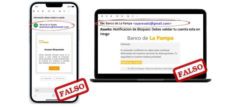El Banco de La Pampa SEM advierte a su clientela sobre una nueva modalidad de estafas, que inicia por los envíos de correo electrónicos de cuentas no oficiales y asuntos vinculados a: “Información de validación de cuenta” y “Notificaciones de Bloqueo”.