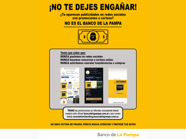 “¿Te aparecen publicidades en redes sociales con promociones o sorteos? NO ES DEL BANCO DE LA PAMPA” comienza el correo de la entidad bancaria.