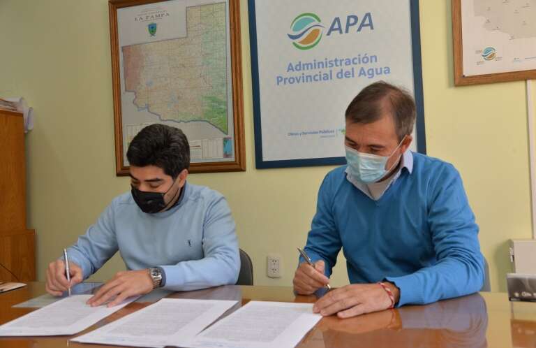 La rúbrica se desarrolló esta mañana en la Administración Provincial del Agua del Ministerio de Obras y Servicios Públicos de la provincia, con la presencia de su titular, Fabricio González Martín y el intendente de Monte Nievas, Germán Wilberger.
