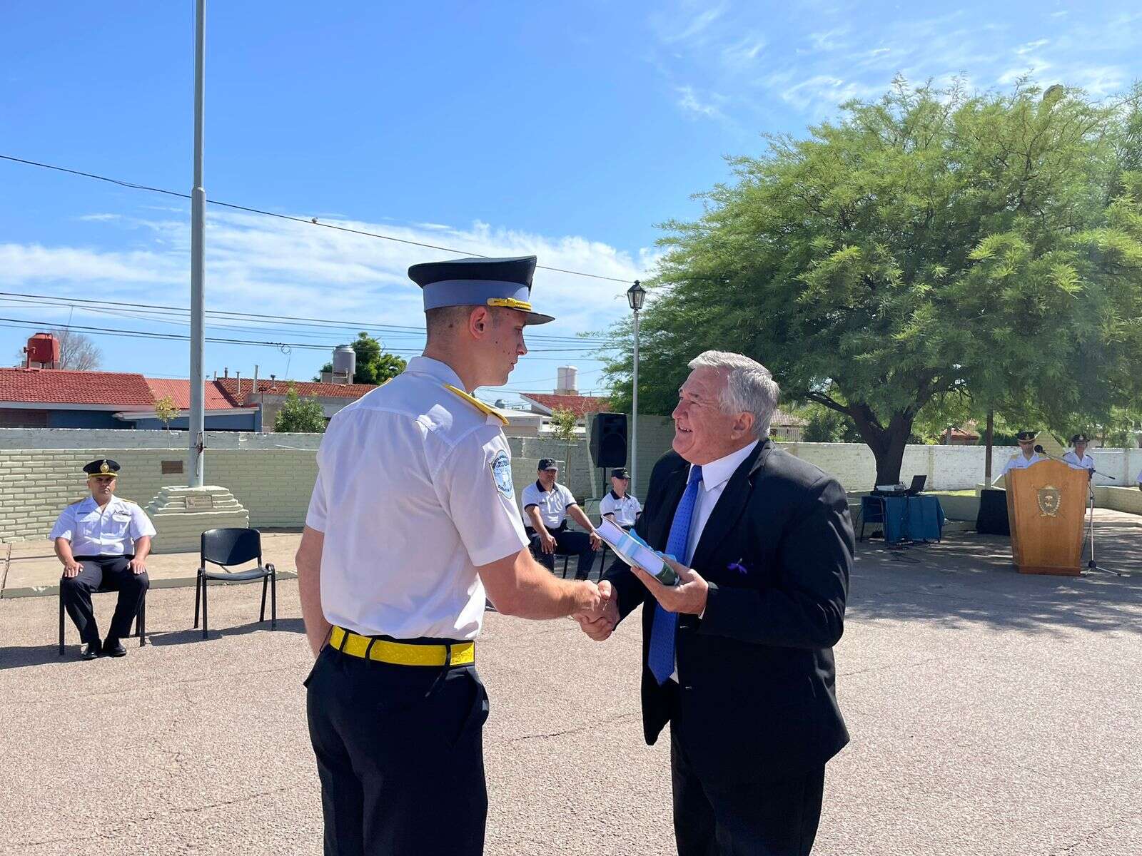 El presidente del Superior Tribunal de Justicia, Hugo Oscar Díaz, le entregó hoy una distinción a Valentín Angiono Ganuza, por obtener el mejor promedio en materias jurídicas entre los egresados de la 45° promoción de oficiales ayudantes de la Policía de La Pampa.
