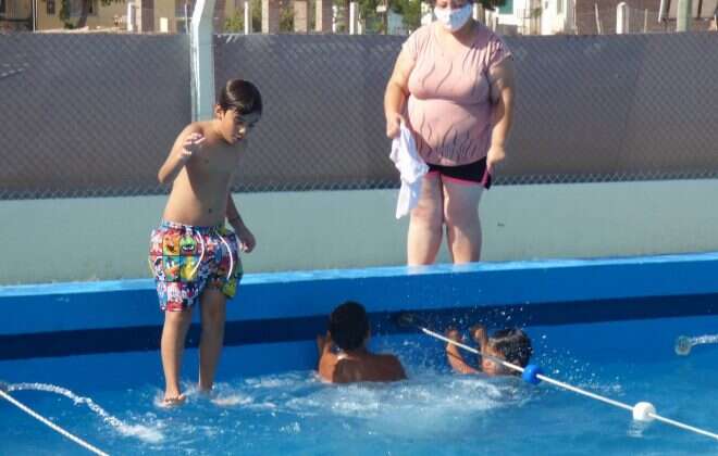 Agregó que “en el predio hacen pileta para aprovechar las horas de calor, pero también se realizan juegos tradicionales y deportes ya que tenemos un polideportivo muy amplio donde podemos trabajar muy cómodos. Las actividades de la colonia de vacaciones son para todas las edades, los chicos y chicas hasta los 14 años por la mañana, en la tarde vienen los del programa Línea Joven desde los 15 años, personas mayores que integran el programa Cumelen, natación y acuagym para adultos”.