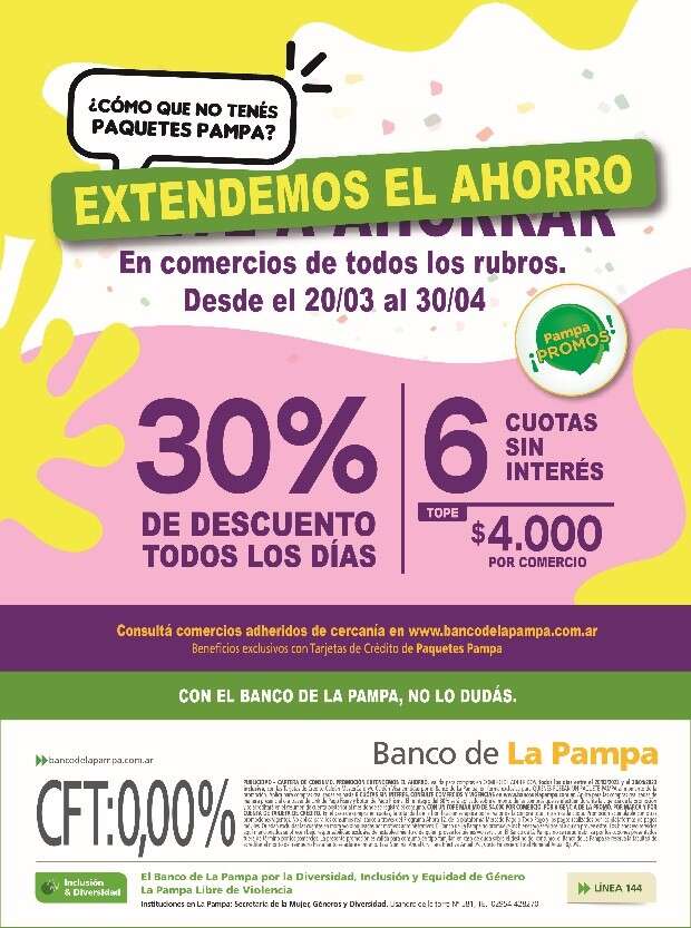 A partir del próximo lunes, más de 120.000 personas clientas con Paquetes Pampa podrán continuar con la promoción “Extendemos el Ahorro”, la cual tendrá un descuento del 30% y hasta 6 cuotas sin interés para compras en comercios de cercanía de todos los rubros. El tope de reintegro será de $ 4.000 por comercio, por marca, por cuenta de tarjeta de crédito entre el 20 de marzo y 30 de abril.