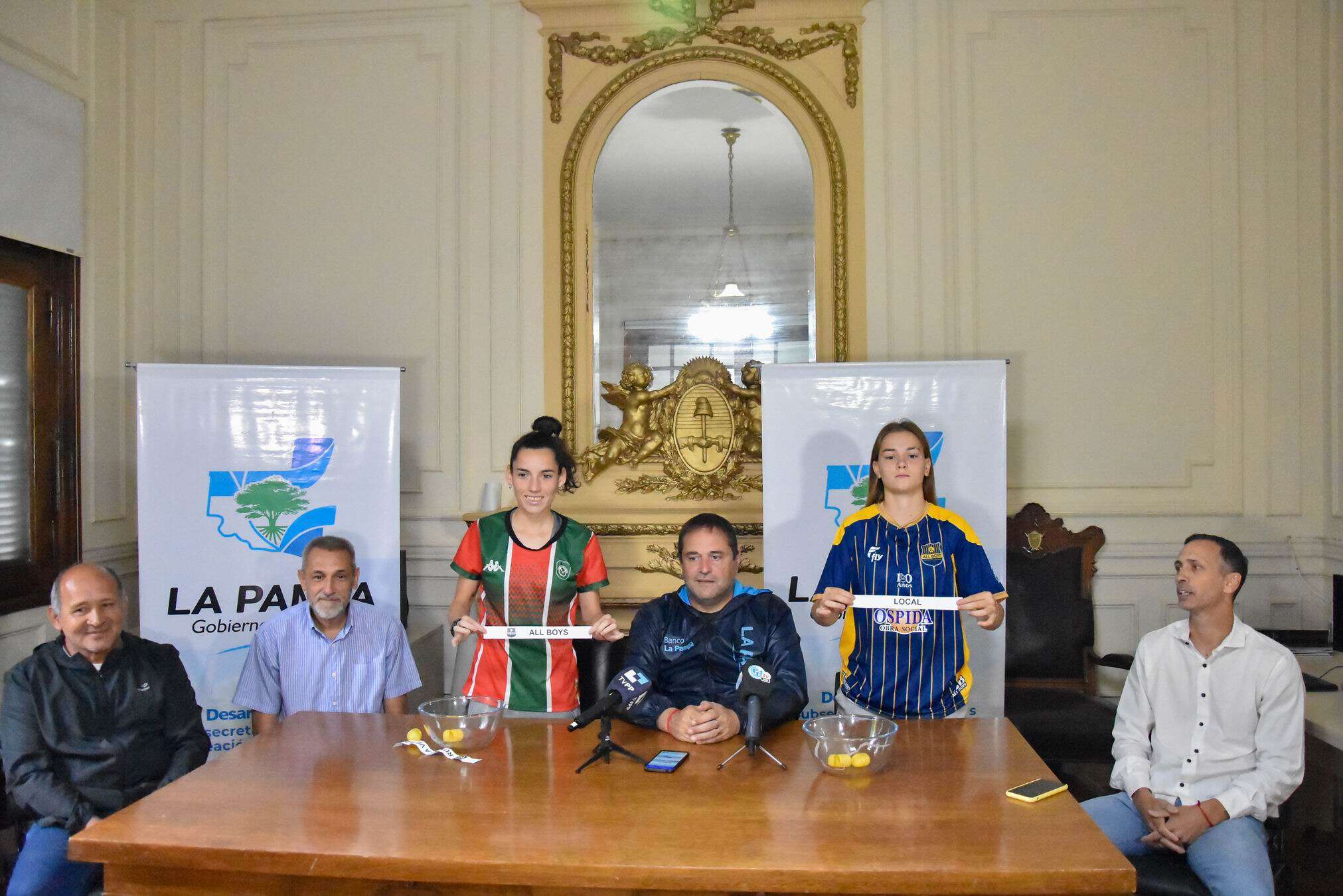 El subsecretario de Deportes, Recreación y Turismo, Ceferino Almudévar, junto a las jugadoras Delfina Fernández (All Boys) y Rocío Altamiranda (Rumbo a Vélez), encabezaron esta mañana el sorteo de las localías en la sede de la Subsecretaría de Deportes acompañados por el presidente de la Liga Cultural, José Clemente y el vice de la Pampeana, Andrés Falagán.