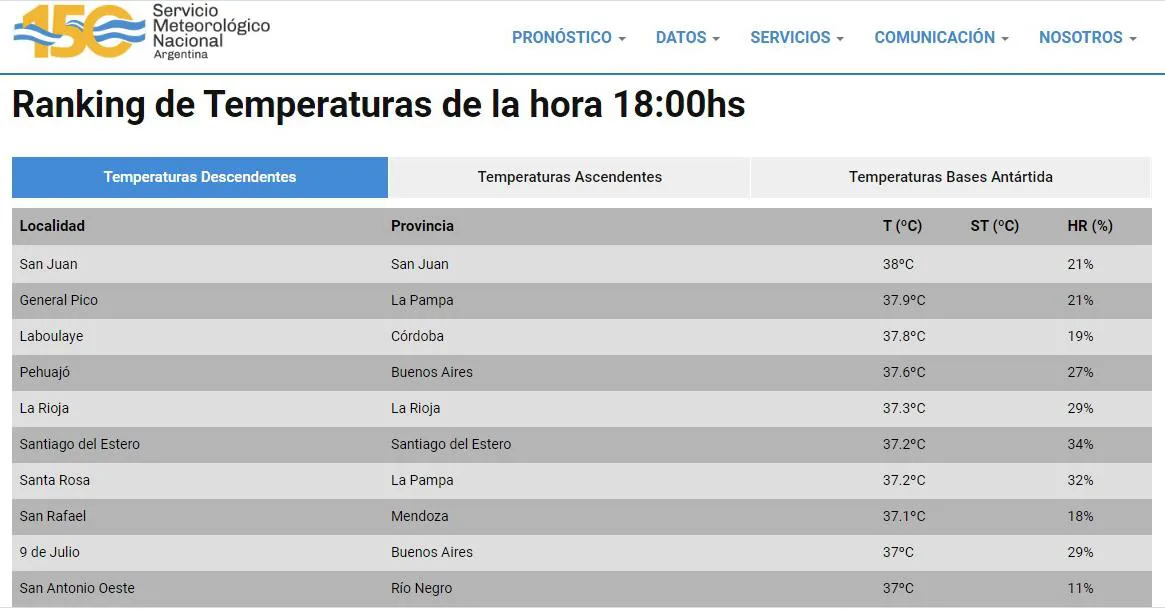 El Servicio Metereológico Nacional elabora un ranking con las temperaturas más altas del país y lo actualiza cada una hora.