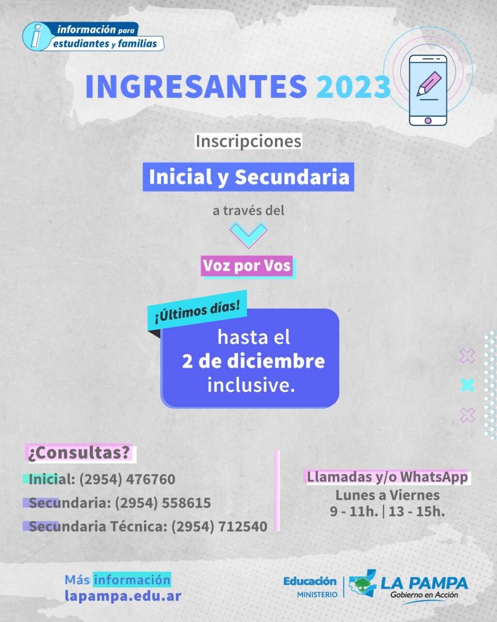 Ante dudas o consultas, pueden visitar el sitio web https://tramites.lapampa.edu.ar/ingreso/ y comunicarse hasta el próximo viernes por medio de llamadas y/o mensajes de WhatsApp de 9 a 11 y de 13 a 15, a las siguientes líneas telefónicas según corresponda: Inicial: (2954) 476760 – Secundaria: (2954) 558615 – Secundaria Técnica: (2954) 712540