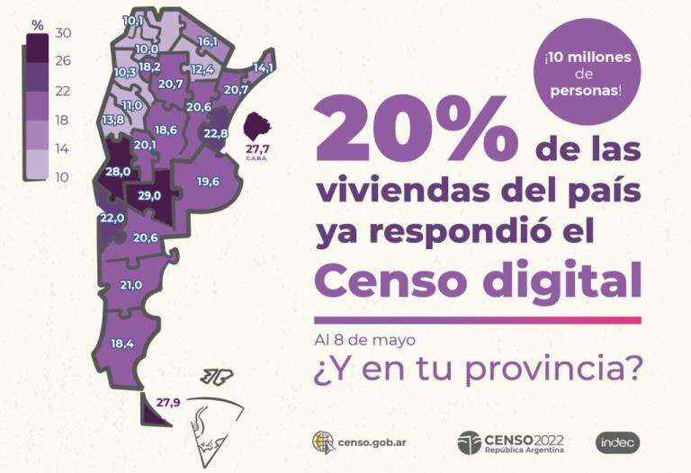 A días de que se realice el operativo presencial del Censo Nacional de Población, Hogares y Viviendas, el 20% de las viviendas del país ya completó el Censo digital y La Pampa es una de las provincias con mayor adhesión, con un 29% de las viviendas auto censadas, seguida por Mendoza y Tierra del Fuego.
