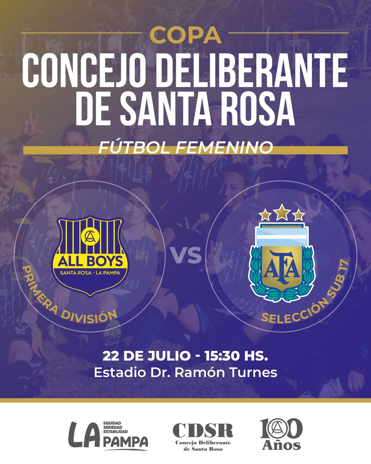 La Selección argentina de fútbol femenino Sub 17 visitará este fin de semana a la ciudad de Santa Rosa para disputar la Copa Concejo Deliberante, frente a la primera división femenina del Club All Boys. El encuentro se disputará el sábado 22 de julio, desde las 15.30, en el estadio Doctor Ramón Turnes.