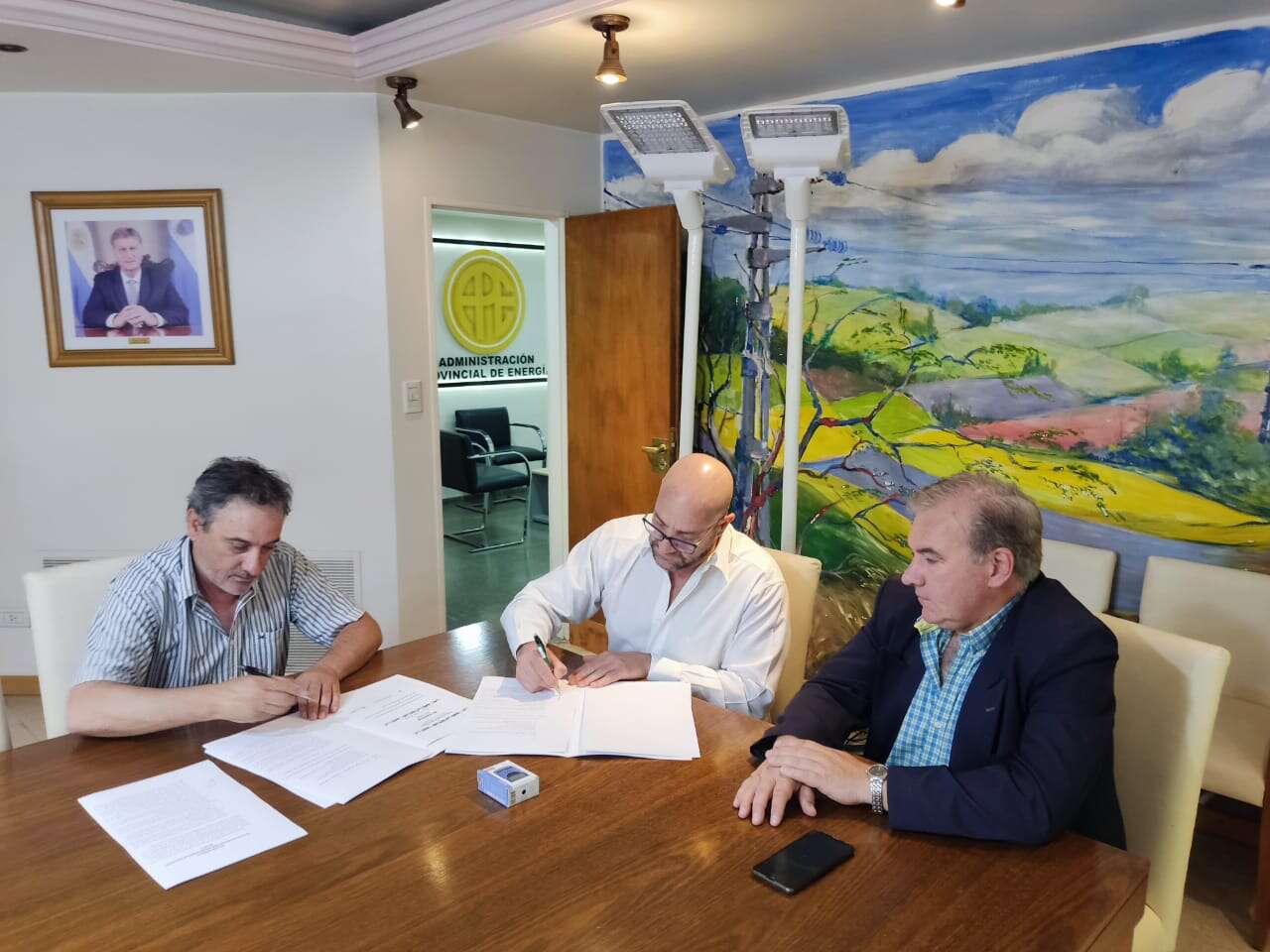 Suscribieron el Acta de Entrega junto al gerente de Coordinación y Planificación de la Administración Provincial de Energía (APE), Daniel Ucciardello, el intendente de Embajador Martini, Ariel Boggino; y de La Adela, Juan Barrionuevo.