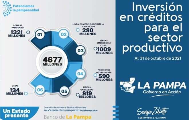 Desde la  Dirección de Asistencia Técnica y Financiera se informó que en estos diez meses de 2021 se invirtieron $ 4677 millones a través de distintas herramientas financieras a tasa subsidiada junto al Banco de La Pampa, en operatorias como el Compre Pampeano, la Línea Comercio, Industria y Servicios, el financiamiento a Proyectos de Inversión, línea Emergencia COVID, las líneas específicas para las actividades ganadera, apícola, entre otras.