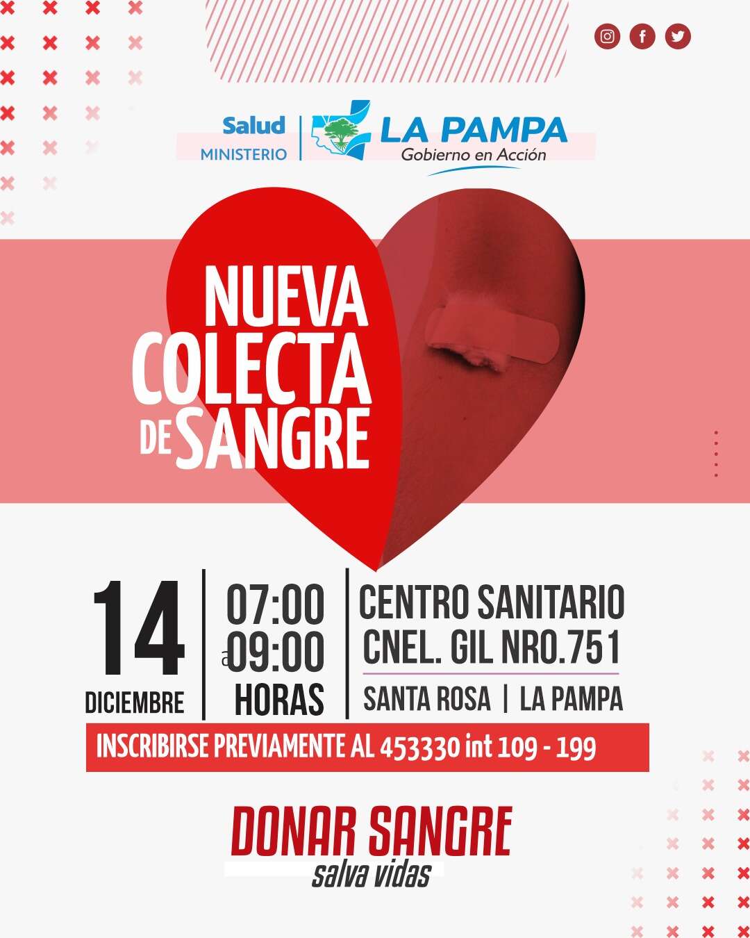 El jueves 14 de diciembre se llevará a cabo en el Centro Sanitario ubicado en la calle Gil 751 de la ciudad capital, una nueva colecta de sangre en el horario de 7 a 9.