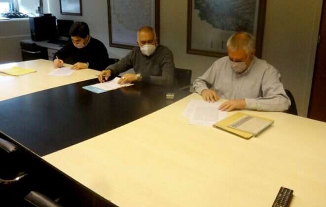 La rúbrica estuvo a cargo del ministro de Obras y Servicios Públicos, Juan Ramón Garary, el titular de la Administración Provincial del Agua (APA), Fabricio González Martín, y el intendente de Metileo, Juan Carlos Pavoni.