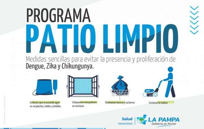 Desde el Gobierno de La Pampa, a través del Ministerio de Salud, se trabaja en la estrategia Integrada del programa “Patio Limpio”, el cual fomenta en la comunidad en general la adopción de medidas sencillas para evitar la presencia y proliferación de vectores o reservorios de enfermedades como Dengue y también Zika, Chikungunya, Leptospirosis, entre otras.
