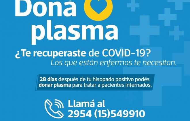 El Ministerio de Salud de la Provincia convoca a personas recuperados de COVID-19, para que puedan donar plasma a los pacientes que lo necesiten. La Pampa cuenta con más de 50 personas transfundidas. El donante tiene que haber pasado 28 días desde su PCR positiva, o por lo menos 14 días del último día del alta de su contacto estrecho si no fue hisopado y no tiene positivo.