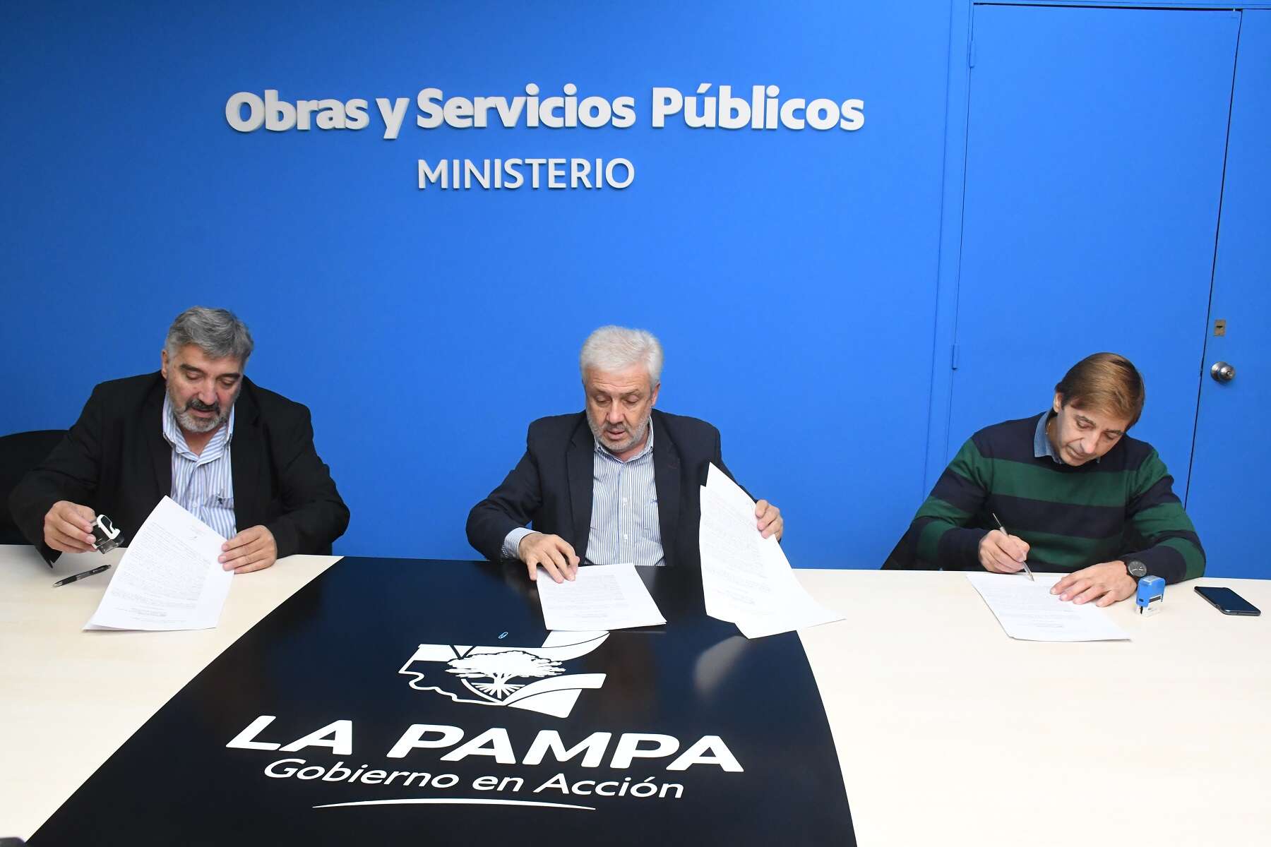 La rúbrica se realizó este jueves en el despacho del Ministerio de Obras y Servicios Públicos de la Provincia, con la presencia del titular del área Julio Rojo, el intendente de la localidad Guillermo Farana y el representante de la empresa B.K. Construcciones.