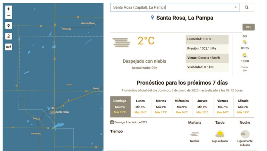 Según el informe del Servicio Meteorológico Nacional (SMN) emitido a las 9:00 horas, la temperatura en la capital pampeana es de 2°C, con cielo despejado y neblina. La humedad alcanza el 100%, el viento sopla desde el oeste a 4 km/h y la visibilidad es reducida, con un alcance de apenas 0,5 kilómetros.