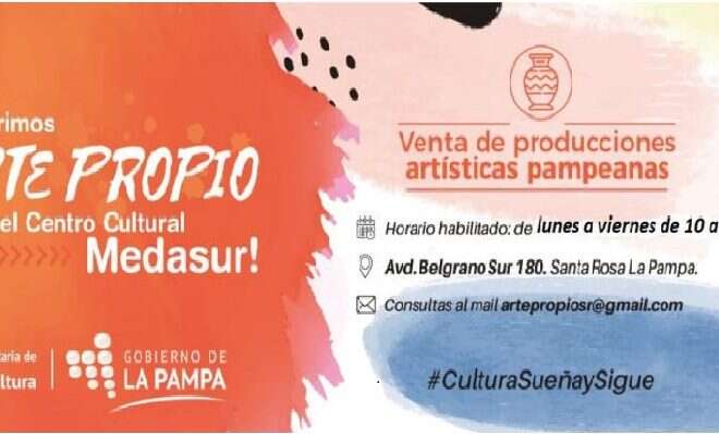 La Secretaría de Cultura del gobierno de La Pampa informó que a partir del 1° de julio, Arte Propio -ubicado en el Centro Cultural Medasur de Santa Rosa, Av. Belgrano Sur 180-, estará abierto al público de lunes a viernes 10 a 13. Consultas al mail: [email protected]
