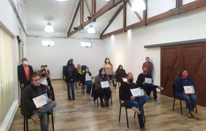 El acto se desarrolló en el Centro Cultural Municipal local, con la presencia de la intendenta, Mónica Curutchet, la directora de Capacitación y Formación Laboral de la Secretaría de Trabajo y Promoción del Empleo, Celeste Segurado Martín y el capacitador, Carlos Sierra.
