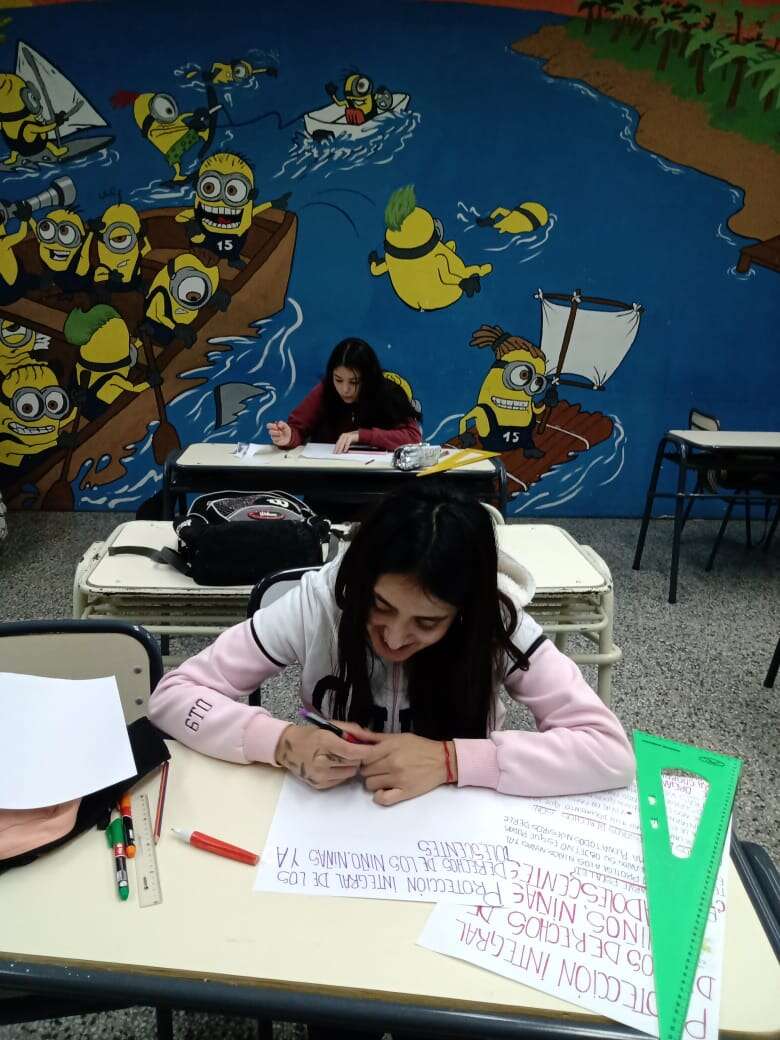 Los/ las estudiantes realizaron varios afiches en clase junto a las/los docentes de construcción de la ciudadanía y de filosofía Anabel Arroyo, de filosofía Soledad Mondino y de Economía Simón Massa.