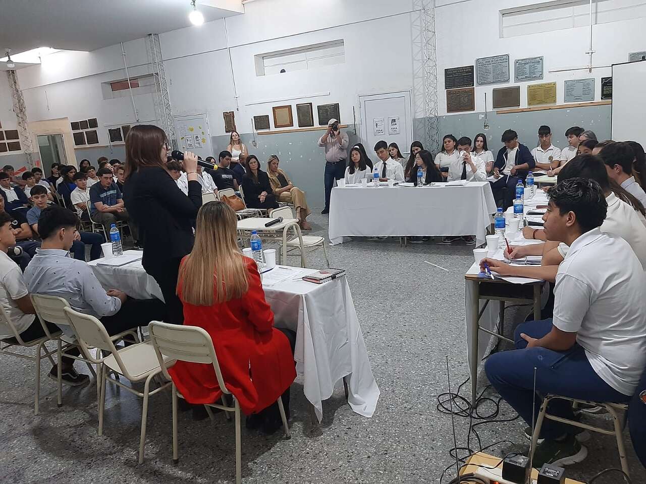 Media centenar de alumnos y alumnos de segundo a sexto año se convirtieron durante tres horas en jueces y juezas, fiscales/as, defensores/as, imputados, víctimas, testigos y peritos para recrear un debate donde un hombre fue acusado de robo y lesiones graves en perjuicio de una mujer.