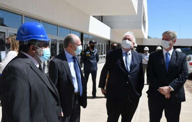 Seguidamente visitaron el Centro Emergente de Asistencia Respiratoria (CEAR), donde se realizó una visualización externa de la institución en la que se encuentran las terapias Intensivas y el servicio de Clínica Médica para pacientes COVID-19 positivo. Del mismo modo se recorrió el Hospital Modular, donde las autoridades provinciales mostraron la obra y explicaron al ministro de Salud cuál fue la estrategia de creación, para dar respuesta a las exigencias de la pandemia.