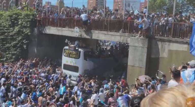 En medio de la caravana que partió del predio de la Asociación del Fútbol Argentino (AFA), llevando a la Selección Argentina a la Ciudad de Buenos Aires, dos personas se tiraron de un puente al micro abierto.