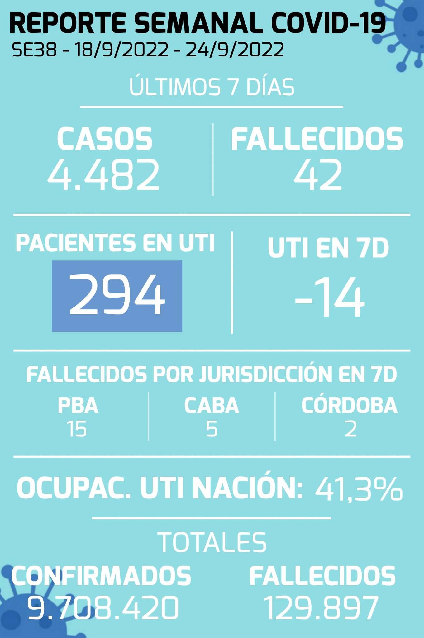 El Ministerio de Salud reportó este domingo 42 muertes por coronavirus y 4.482 contagios en la última semana en la Argentina, lo que representa un 27% menos de casos que el domingo pasado cuando se registraron 6.175 casos positivos. De acuerdo a los datos difundidos, la cantidad de muertes aumentó 68% en relación a la semana pasada cuando se habían informado 25 fallecimientos.