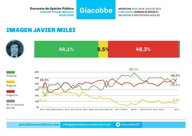 Sobre 2.500 casos consultados, con un margen de error del 2%, los datos obtenidos desde el 24 al 28 de julio arrojaron un resultado del 44% de imagen positiva en el mes de julio, mientras que en junio había sido del 48%: “La estabilidad de la variable es clara. Se mueve entre 44-50%. Subió la negativa”, añadió Giacobbe.
