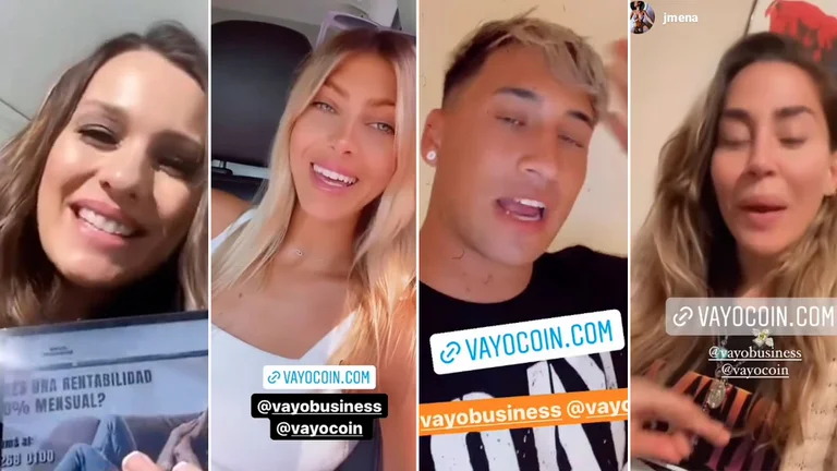 Así, celebridades como Yao Cabrera, Julieta Nair Calvo, Horacio Cabak, José María Listorti, Candelaria Ruggeri, Jimena Barón, y Cinthia Fernández, entre tantos otros, miraron a la cámara de su teléfono e hicieron anuncios para el grupo en stories de Instagram y en Youtube. L-Gante realizó tres videos distintos. Zaira Nara incluso dijo que opera en el sistema “con sus ahorros personales”. Pampita Ardohain anunció el sorteo de un iPhone 11 a cargo de la empresa e invitaba a seguir las redes de Vayo como único requisito para participar. Natalia Oreiro también puso su cara para anunciar otro “¡mega sorteo!”, un auto cero kilómetro. Otra vez, solo había que seguir a Vayo en sus redes. Lionel Ferro, actor y youtuber con un capital de 7,7 millones de seguidores en Instagram, posó con toda su familia el 1° de marzo último para anunciar el sorteo de otro auto, un Peugeot 208 Active “solo para clientes del Grupo Vayo”.