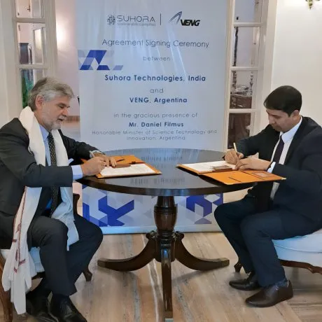 La firma se llevó a cabo este lunes en la residencia del embajador de Argentina en la India, Hugo Javier Gobbi, y contó con la presencia de los co fundadores de Suhora, Amit Kumar, Rupesh Kumar y Krishanu Acharya. Además estuvo presente el director general de la Indian Space Association (ISPA), Anil Kumar Bhatt.
