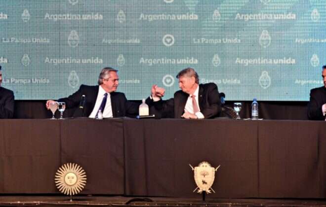 El gobernador Sergio Ziliotto gestionó los recursos que habilitan la ejecución de obras del Plan Nacional “Argentina Hace”. El acuerdo se firmó con el titular de la cartera nacional de Obras Públicas, Gabriel Katopodis, en oportunidad en que el presidente Alberto Fernández visitara La Pampa, y asciende a $ 575 millones para 63 localidades pampeanas.