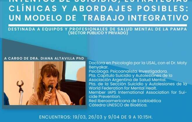 Contó con la participación de más 200 psicólogos/as, psiquiatras y trabajadores/as sociales. Estuvo a cargo de la doctora Diana Altavilla, reconocida especialista en la materia a nivel nacional e internacional. Fue coordinado por el director de Prevención, Promoción y Capacitaciones, Lautaro García y dirigido a equipos de Salud Mental de la Provincia, de los sectores público y privado.